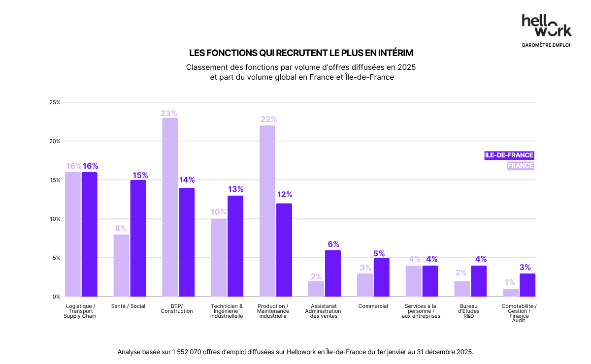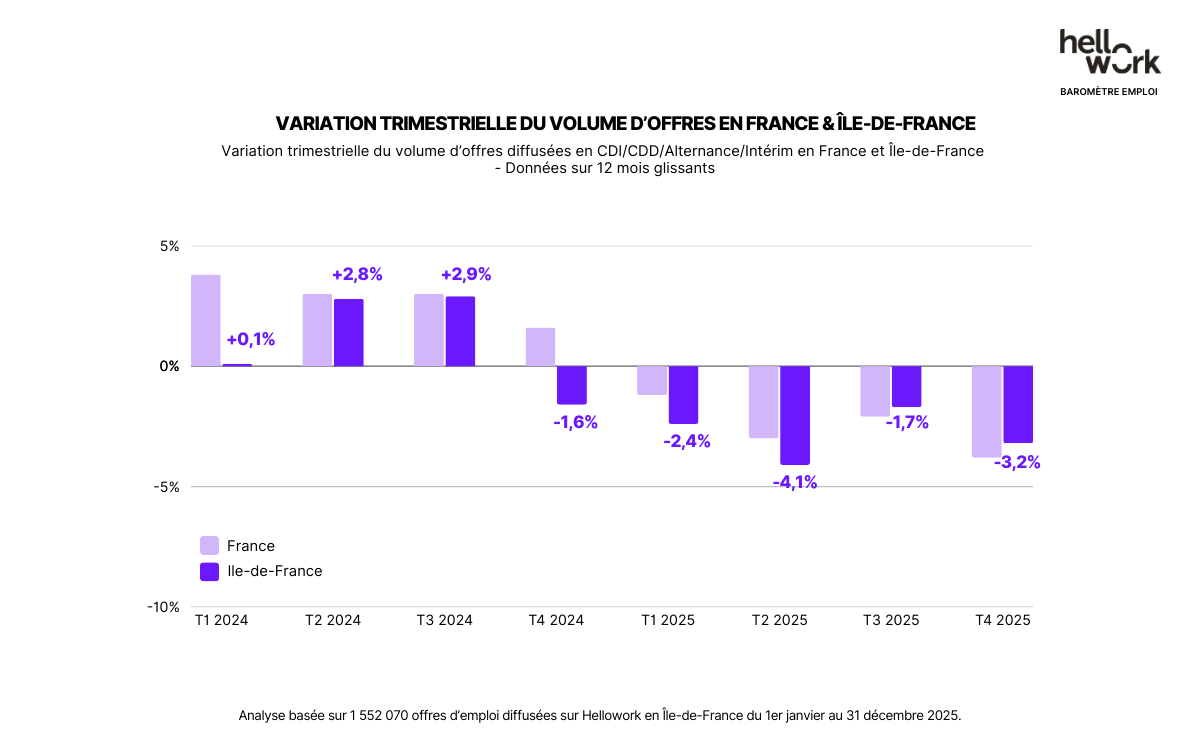*analyse basée sur 1 552 070 offres d’emploi diffusées sur Hellowork en Île-de-France du 1er janvier au 31 décembre 2025.