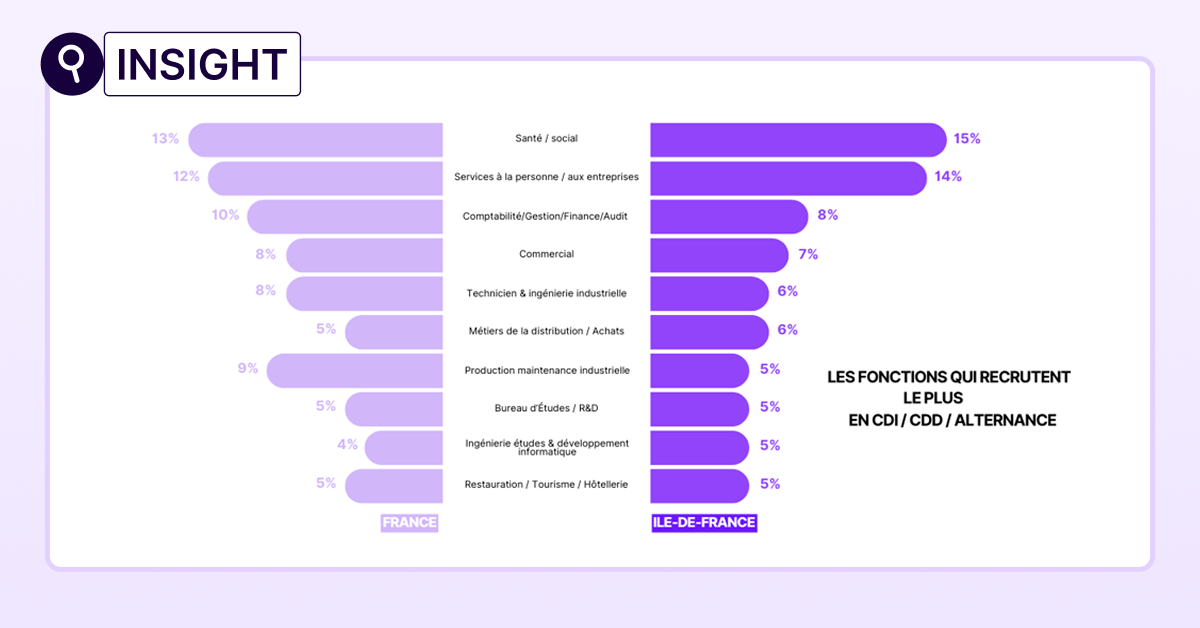 Du côté des fonctions qui recrutent, l’Île-de-France s’inscrit largement dans la hiérarchie observée au niveau national. Le trio de tête reste inchangé : la santé / social arrive en première position, avec 15 % des offres publiées en CDI, CDD et alternance, devant les services à la personne et aux entreprises (14 %) et la comptabilité / gestion / finance / audit (8 %).