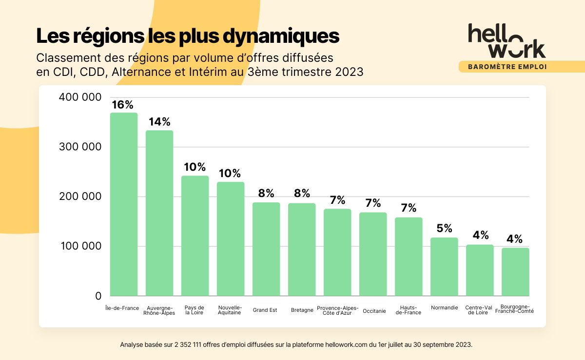 L’Ile-de-France, l’Auvergne-Rhône-Alpes, les Pays de Loire et la Nouvelle-Aquitaine constituent le quatuor de tête des régions qui recrutent le plus, avec respectivement 16%, 14%, 10% et 10% du volume d’offres diffusées sur la plateforme de recrutement au 3e trimestre.