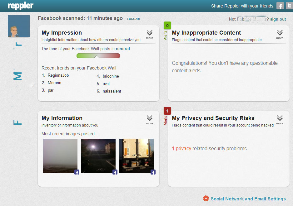 Autre solution : utiliser Reppler, un nouvel outil bien pratique qui vient de sortir (voir l’article sur Clubic). Il permet, en scannant automatiquement votre profil via Facebook connect, de savoir si l’impression que vous donnez est plutôt neutre, positive, ou négative (cliquez sur l’image à droite pour voir en grand à quoi ça ressemble). Reppler vous signale aussi les contenus inappropriés ou les failles de sécurité (comme des infos personnelles qui s’affichent à tout le monde) en vous proposant de les corriger directement via les paramètres de confidentialité. A propos de confidentialité, n’oubliez pas aussi de consulter le manuel de la vie privée sur Facebook traduit sur le blog du modérateur).