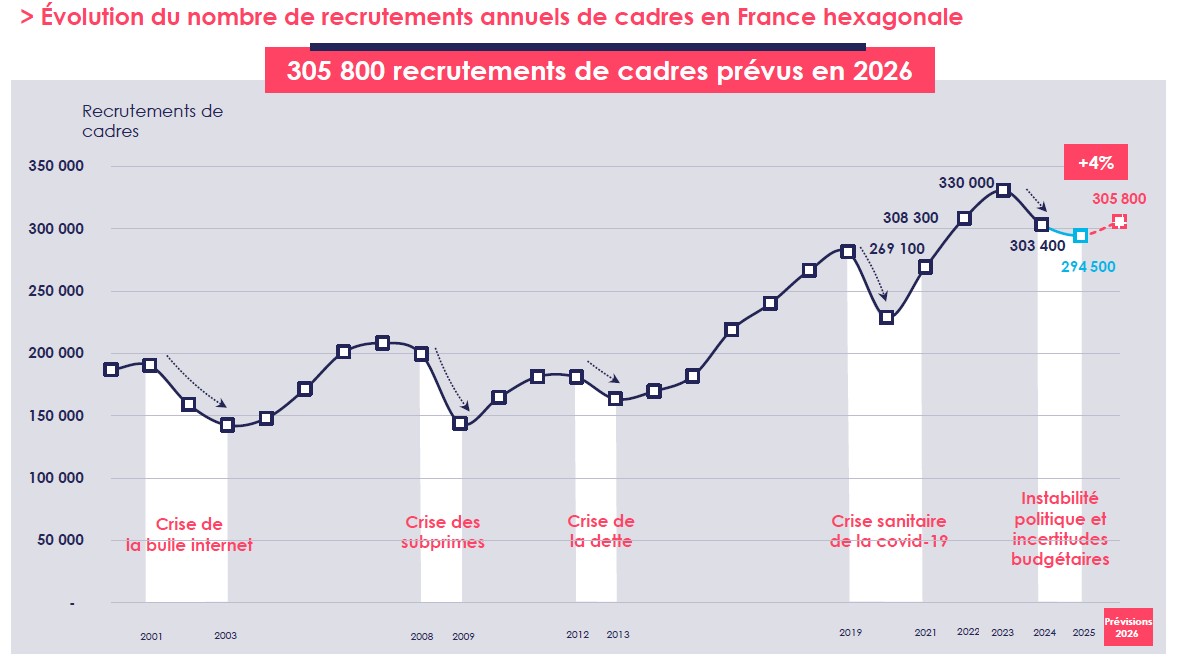 Après deux ans de contraction des recrutements de cadres, la tendance devrait s’inverser en 2026. En 2025, les entreprises françaises ont recruté 294 500 cadres, soit un fléchissement de 3 % sur un an. Mais en 2026, les embauches de ces profils devrait franchir à nouveau la barre des 300 000, d’après les dernières prévisions de l’Apec*. Une tendance qui confirme les études parues en début d’année.