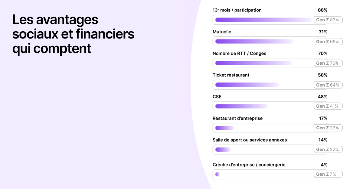 Au-delà des traditionnels avantages tels que la mutuelle ou la participation, la génération Z attend également de son entreprise qu’elle contribue à son épanouissement en dehors du travail. 76% de ces candidats sont attentifs au nombre de jours de congés payés et de RTT, 64% à la présence de tickets-restaurant et 22% à des services liés au sport.