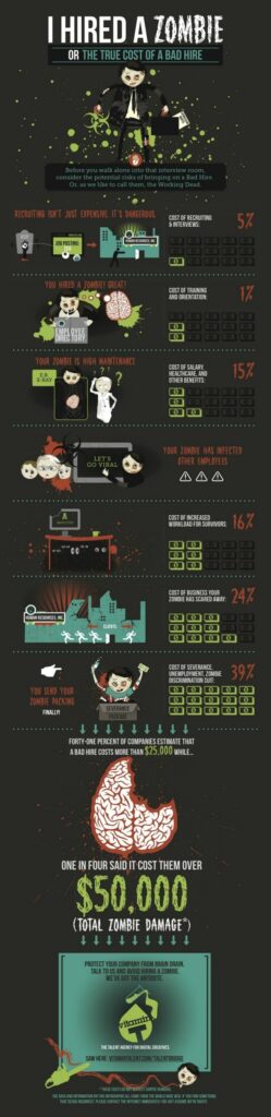 Rater un recrutement peut coûter cher à une entreprise ! L’adage « mieux vaut être seul que mal accompagné » fonctionne également très bien au travail, ou parfois il vaut mieux être en sous-effectif que de recruter un potentiel boulet… Vitamin T, agence de recrutement américaine, s’est amusée à en faire une infographie intitulé « I hired a zombie ». Le zombie, c’est celui qui peut tout simplement… couler votre boîte !