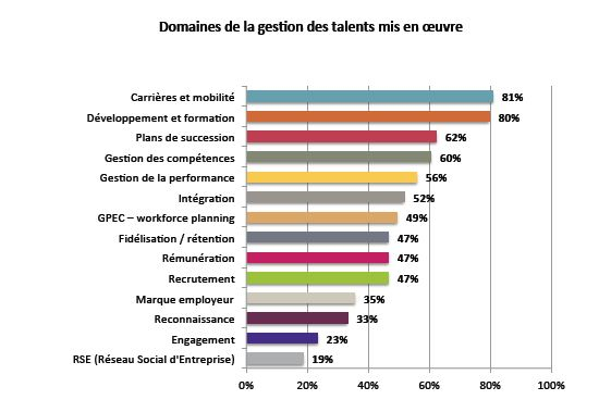 Qu’est-ce que recouvre la gestion des talents dans les entreprises ? Deux domaines prioritaires se détachent en tête des priorités des RH : la gestion des carrières et de la mobilité d’une part, le développement des compétences et la formation d’autre part qui sont à 80% les deux premiers domaines de la gestion des talents. A contrario certains sujets à la mode ne semblent pas encore en têtes des priorités. C’est le cas de la marque employeur, un concept qui reste l’apanage des grands groupes, mais aussi des réseaux sociaux d’entreprise. « Le succès médiatique des réseaux sociaux d’entreprise ne semble pas trouver un écho à la hauteur dans les politiques de gestion des talents des entreprises interrogées » relève l’ANDRH.