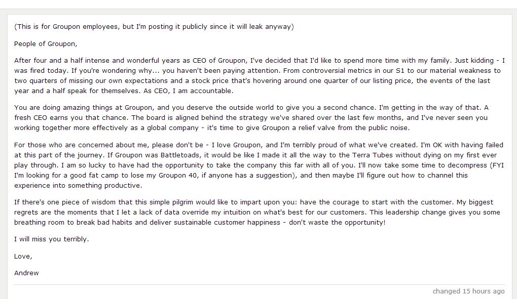 Après quatre années et demie intenses et merveilleuses en tant que PDG de Groupon, j’ai décidé que j’aimerais passer plus de temps avec ma famille. Non je plaisante, j’ai été viré aujourd’hui. Si vous vous demandez pourquoi… c’est que vous n’avez pas suivi les évènements récents. Des résultats controversés pendant notre premier semestre, des faiblesses structurelles, 2 semestres à ne pas atteindre les résultats que nous avions fixés et un prix de l’action à un quart de la valeur de départ, les évènements de l’année dernière parlent d’eux-mêmes. Et en tant que PDG je suis le responsable. Vous faites des choses géniales à Groupon et vous méritez que le monde extérieur vous donne une seconde chance. Je vous empêche que cela arrive. Un nouveau président va vous assurer cette chance. Le comité d’administration s’est fixé sur une stratégie que nous partageons depuis ces derniers mois, et je ne vous ai jamais vu travailler aussi efficacement en tant qu’entreprise mondiale. Il est temps de donner à Groupon un répit par rapport à tout ce vacarme.