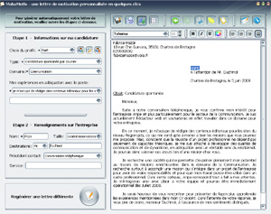 Ensuite, on passe à la phase de génération de la lettre. Vous avez le choix entre plusieurs modèles (candidature spontanée par courrier ou par mail, réponse à une offre…), vous pouvez précisez le nom du contact, de l’entreprise… Un clic sur le bouton générer la lettre et la page blanche se remplit comme par magie. C’est presque trop beau pour être vrai mais le résultat n’est pas si mauvais que cela. Avec un petit côté langue de bois de candidature et des phrases toutes faites (Exemple : « Je me suis attaché à développer des qualités de communication et de dynamisme, en adéquation avec un véritable sens du relationnel »). Mais au moins cela donne une trame à personnaliser. Plus vous donnerez d’informations précises sur votre savoir-faire et plus le résultat sera qualitatif.