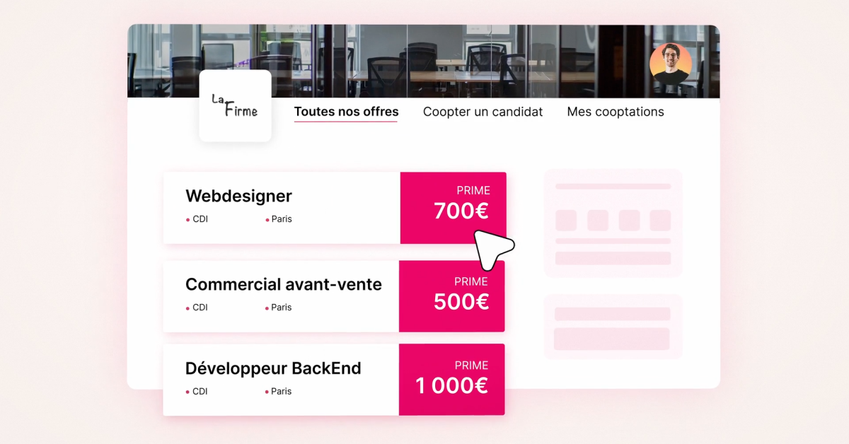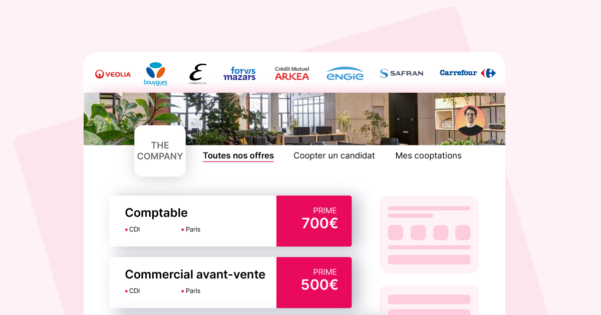 Chacun de vos collaborateurs peut accéder à votre portail de cooptation et de mobilité interne, conçu aux couleurs de votre entreprise. Ils peuvent ainsi consulter vos offres en cours, les partager d’un clic à l’ensemble de leur réseau ou postuler facilement dans le cas d’une mobilité interne.
