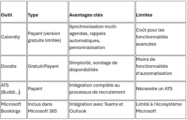 Lorsque plusieurs personnes doivent participer à un même entretien d’embauche, la synchronisation des agendas devient un casse-tête. Les outils de planification connectés aux calendriers professionnels (Outlook, Google Agenda) détectent automatiquement les disponibilités communes et ne proposent que les créneaux où tous les intervenants sont libres, facilitant ainsi la coordination du recrutement. Cette fonctionnalité évite les doublons et les rendez-vous impossibles à honorer.