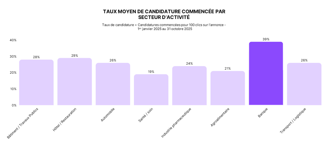Dans la banque, un peu plus d’un candidat sur trois (39 %) qui consulte une offre entame le processus de candidature. Dans l’hôtellerie-restauration, c’est 10 points de moins (29%), dans la santé, 20 points (19%). D’où l’importance pour les acteurs de la banque à travailler la visibilité et l’attractivité de leurs offres.