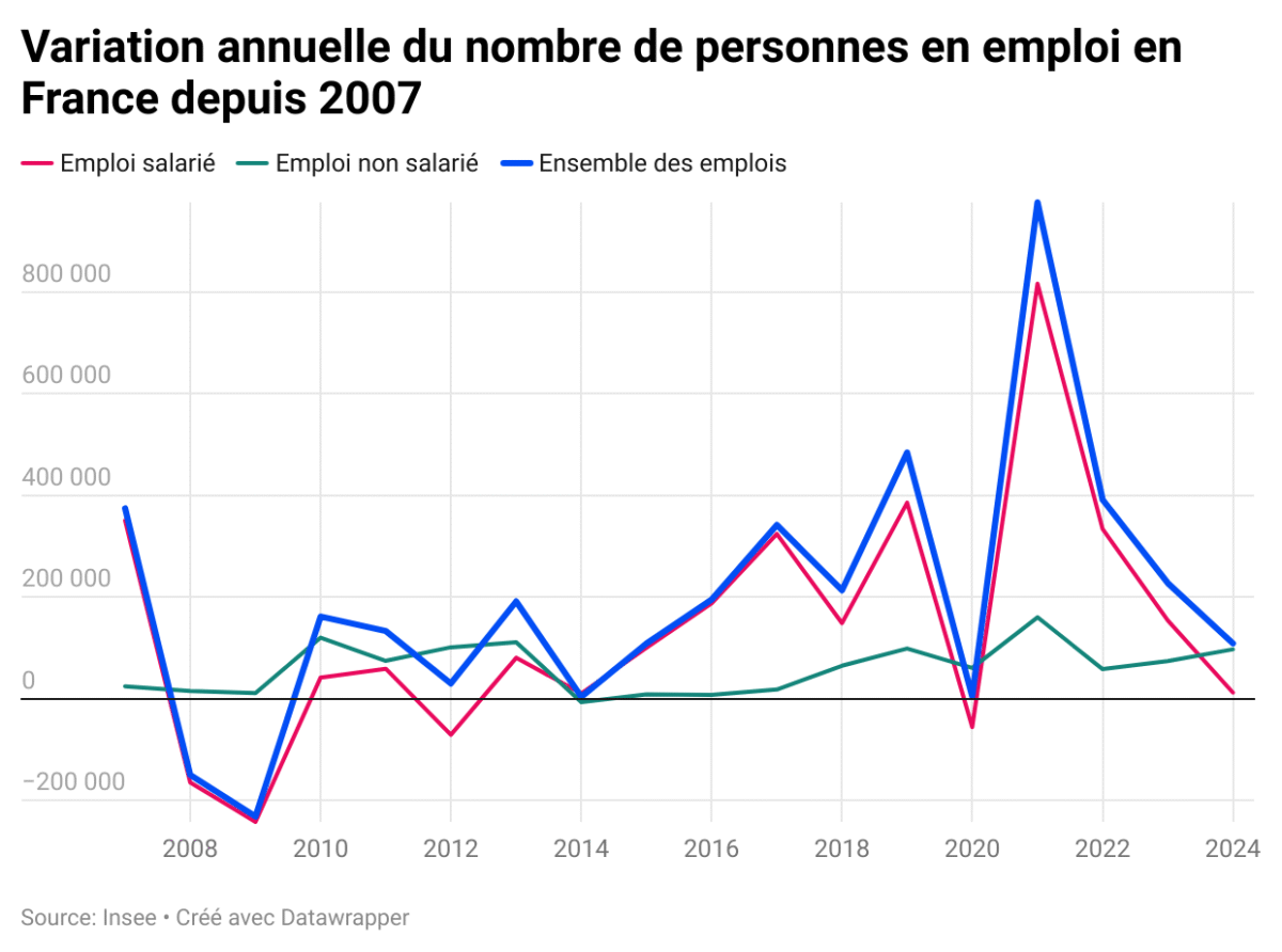 « Ce nouveau ralentissement de l’emploi s’inscrit dans un contexte de moindre croissance économique, le produit intérieur brut (PIB) augmentant de 1,2 % en 2024, après +1,4 % en 2023 et +2,7 % en 2022 », note l’Insee.