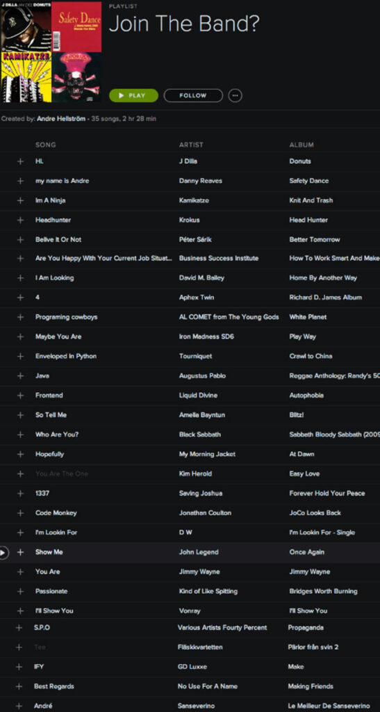 Ce n’est pas la première fois que Spotify utilise son propre service pour recruter. Pour attirer des développeurs, elle avait mis en ligne la playlist « Join the Band ? » présentant les compétences requises, leur demandant s’ils étaient heureux dans leur poste actuel et les incitant à postuler.