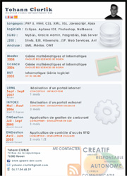 Dans la série des CV originaux, en voici un qui allie la tradition et la modernité. Le concept élaboré par Yohann Ciurlik est un CV papier web 2.0. Un curriculum vitae classique dans sa structure avec une touche de graphisme 2.0 : un nuage de tags pour décrire ses qualités, le logo RSS dans la rubrique contact et des images pour illustrer trois pavés (langages informatiques, formation et expériences) qui correspondent bien à son profil d’ingénieur développement. Le tout avec une charte graphique inspirée du site d’une entreprise de son secteur…